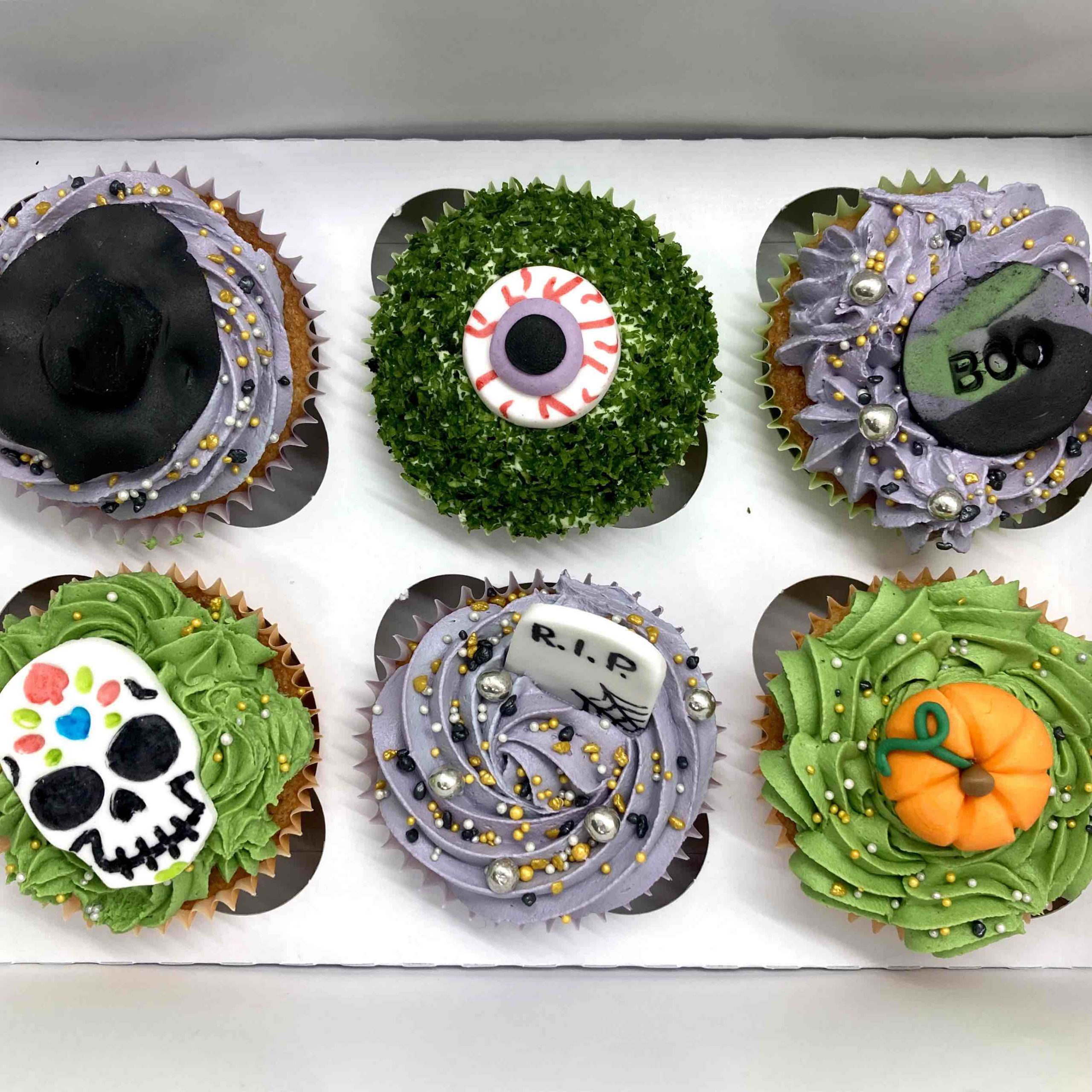 A selection of delicious Halloween cupcakes, finished with handmade fondant toppers. Absolutely perfect for your Halloween parties!